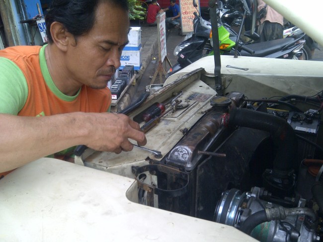 Very thick water steam comes out from radiator cap (not yet fully open), I leave it at that until the steam disappear, mean while I bought two 1.5 liter mineral water from nearby stall. Finally I turn on the engine and open the radiator cap fully (very carefully) and start pouring it.. very slowly… very-very slowly…until the gauge now back to slightly below “N”. (Never pour the cold water at once, do it slowly otherwise there will be a good chance damaging the cylinder head and a lot safer too… )